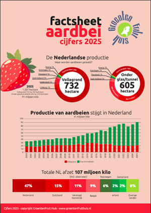 Jongeren weten aardbeien steeds beter te vinden, een belangrijke ontwikkeling voor de toekomst van de sector. De stijgende vraag vertaalt zich in een verdere ontwikkeling van de teelt. Het areaal aardbeien komt in 2025 uit op 1.337 hectare. Daarvan wordt 732 hectare in de vollegrond geteeld en de teelt onder glas (incl. tunnelteelt) bestaat uit 605 hectare.