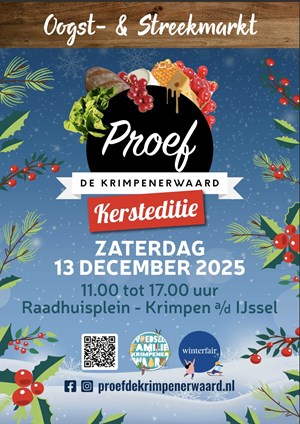 Op zaterdag 13 december is er weer een editie van de Winterfair en onze Oogst- & Streekmarkt ‘Proef de Krimpenerwaard’. Dit keer creëren wij met elkaar een warm winters decor en brengen jou op het Raadhuisplein en in winkelcentrum Crimpenhof in Kerstsferen. Je vindt er niet alleen de (h)eerlijkste…